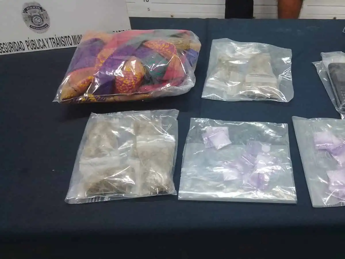 Policías de la Secretaría de Seguridad Pública y Tránsito Municipal de Solidaridad aseguraron a dos sujetos y 29 envoltorios con posibles drogas como cristal y marihuana en la colonia irregular In House.