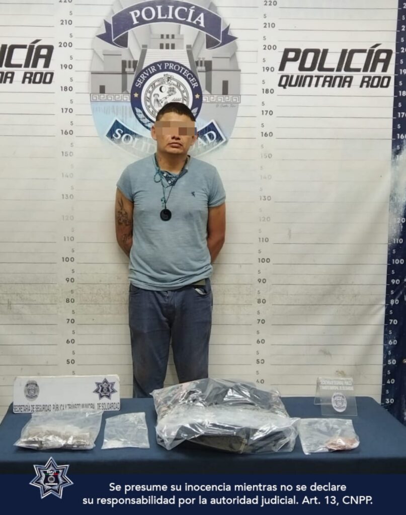 La Policía Municipal de Solidaridad aseguró en distintos puntos de la ciudad a 3 sujetos y más de 70 envoltorios y 4 empaques con posibles drogas