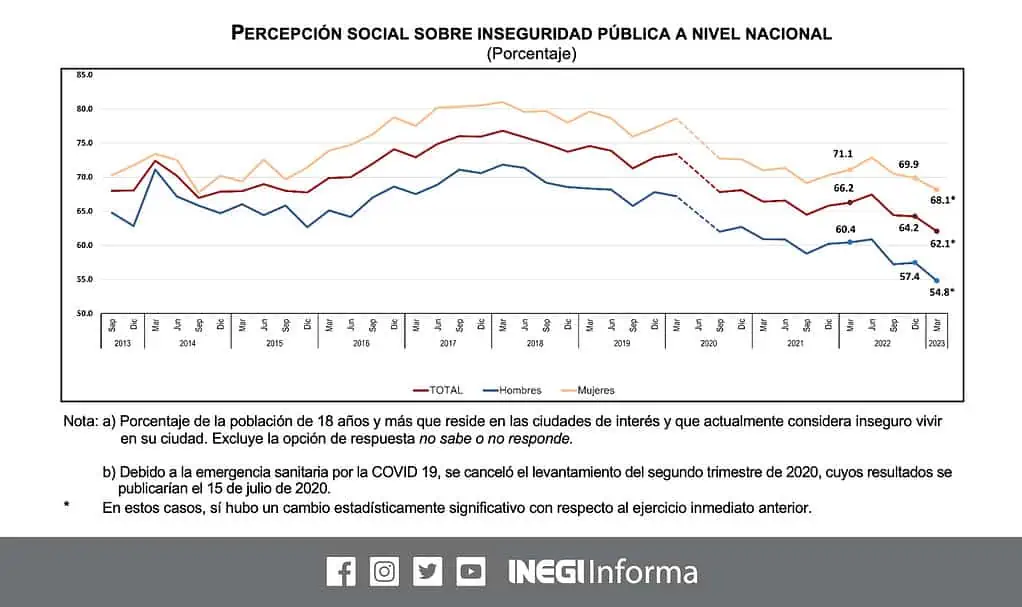 De acuerdo a los resultados de la Encuesta Nacional de Seguridad Pública Urbana (ENSU), correspondiente al primer trimestre de 2023, a nivel nacional, el 62.1% de la población de 18 años y más consideró inseguro vivir en su ciudad.