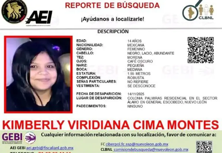 Buscan a adolescente de 14 años en Escobedo; habría contactado a alguien por Roblox. Kimberly Viridiana, una adolescente de 14 años, fue reportada como desaparecida tras ser vista por última vez el 14 de noviembre en la colonia Palmiras Residencial, en el sector Álamo del municipio de Escobedo, Nuevo León. Sus familiares solicitan el apoyo de la ciudadanía y de las autoridades para lograr encontrarla.