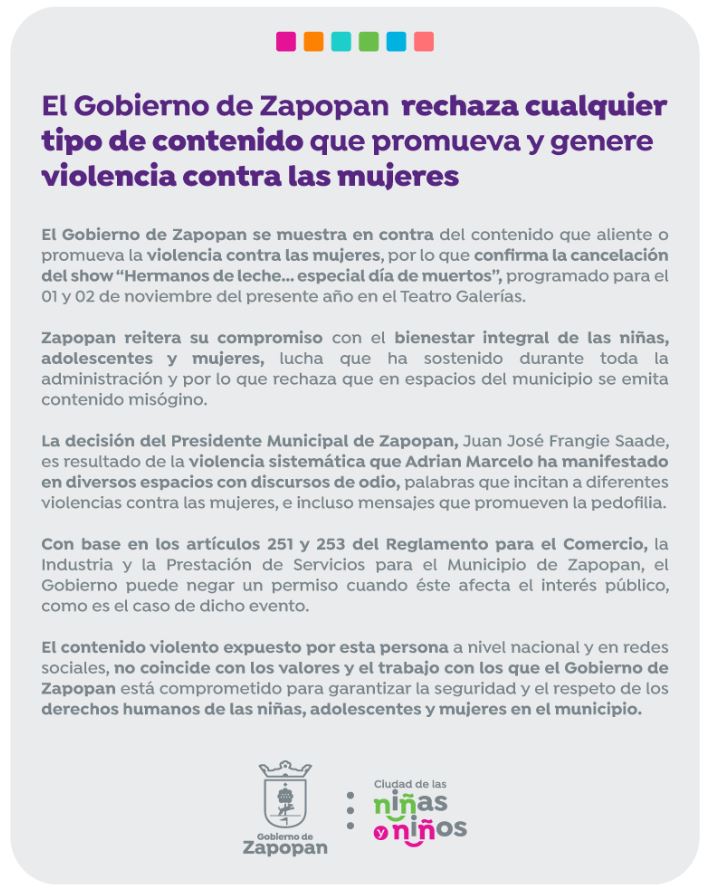 Este miércoles, el Gobierno de Zapopan emitió un comunicado anunciando la cancelación del evento de comedia de Adrián Marcelo y “La Mole”, que estaba programado para el 1 y 2 de noviembre en el Teatro Galerías.