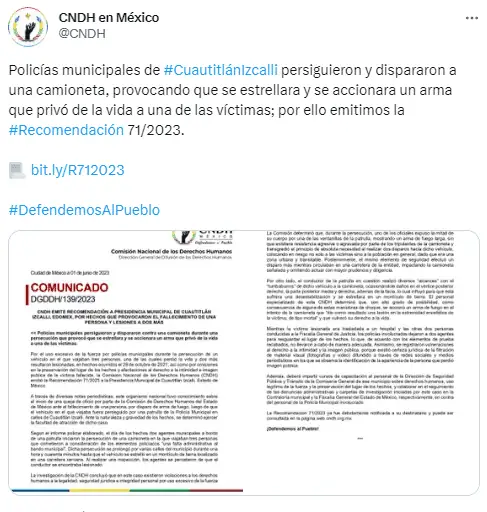 El municipio de Cuautitlán Izcalli, recibió una recomendación emitida por la CNDH, por el uso excesivo de la fuerza policial durante la persecución que llevó a la muerte del actor Octavio Ocaña.
