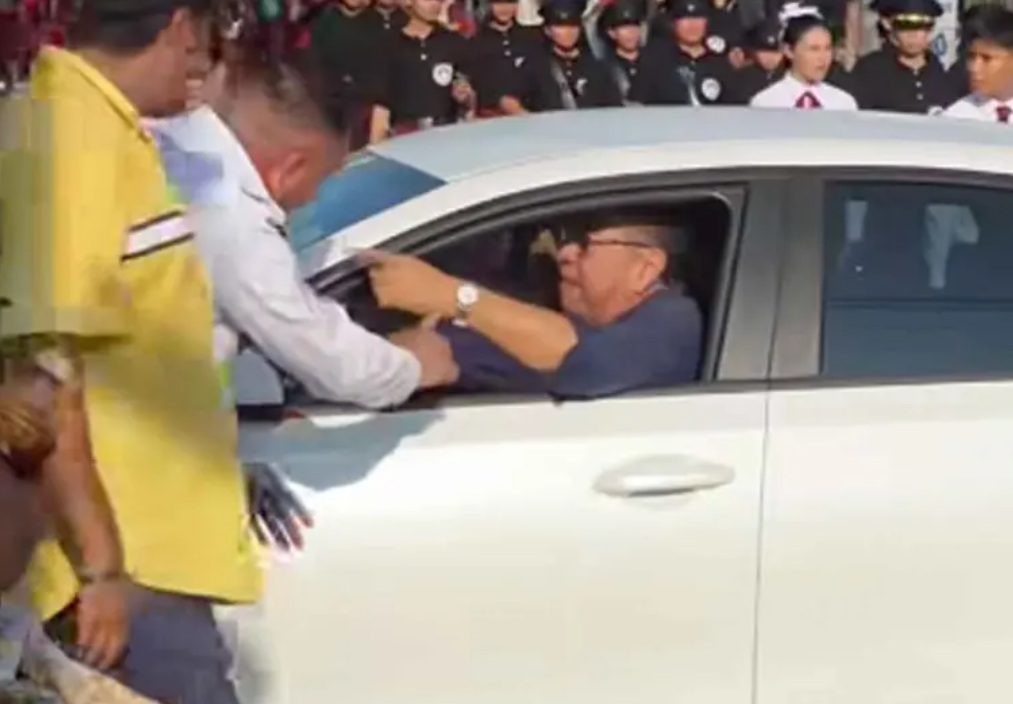 El vehículo avanzó entre los participantes justo en el momento en que marchaban estudiantes de primaria, generando escenas de preocupación entre familias y autoridades. Testigos señalaron que el conductor manejaba de forma imprudente y rozó con su vehículo a pocos centímetros a un agente de Tránsito que resguardaba la zona.