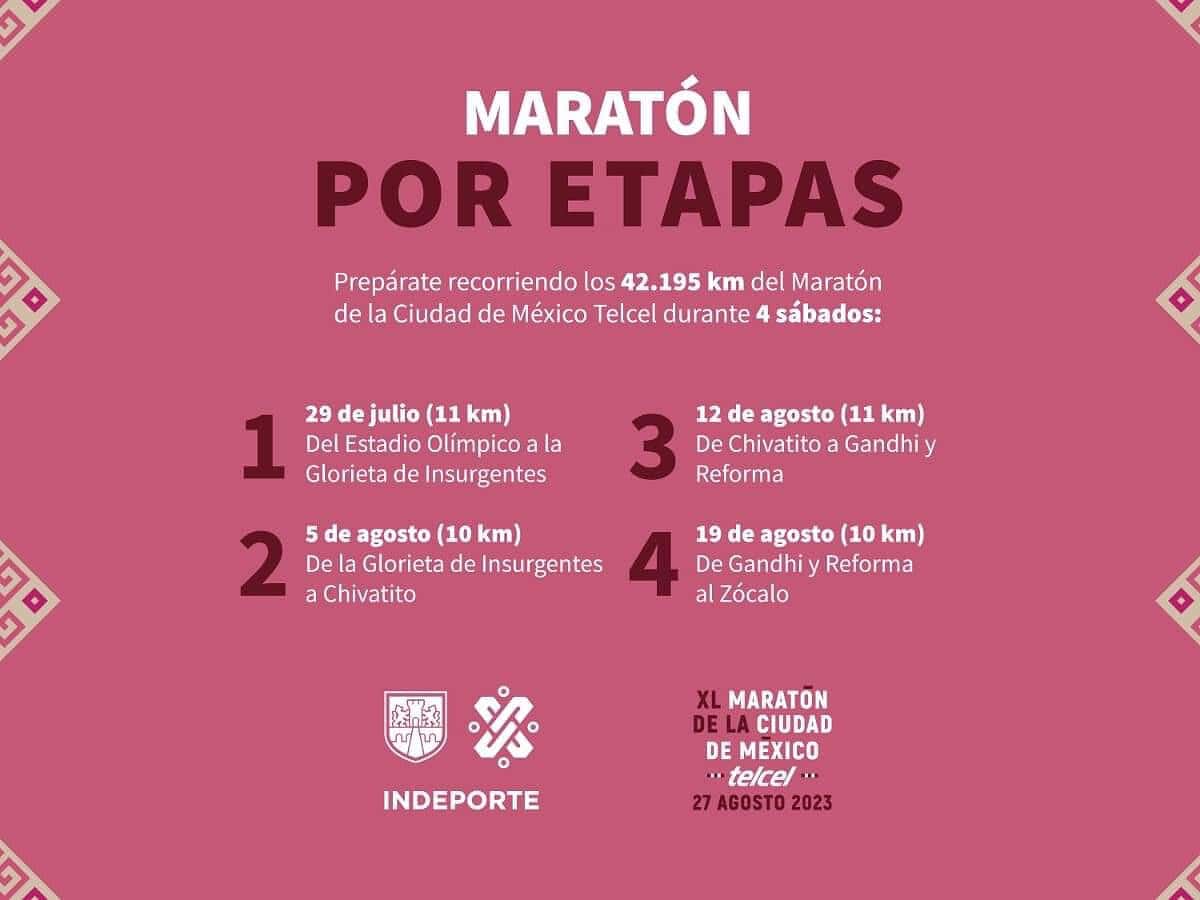 En redes oficiales del Maratón CDMX 2023 publicaron que se correrán los 42 kilómetros y 195 metros en cuatro etapas, antes del evento. Por lo cual, cada fin de semana se conocerán diferentes partes de la ruta, con el fin de que los corredores generen su estrategia.