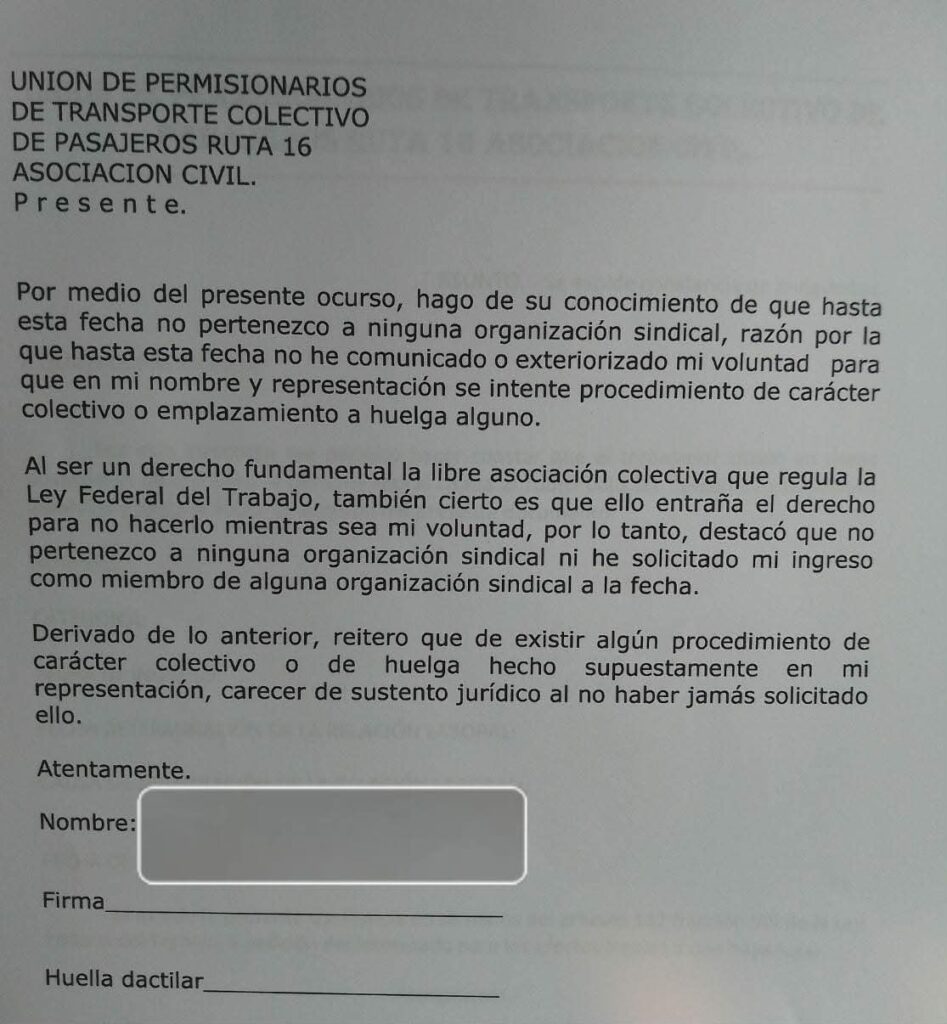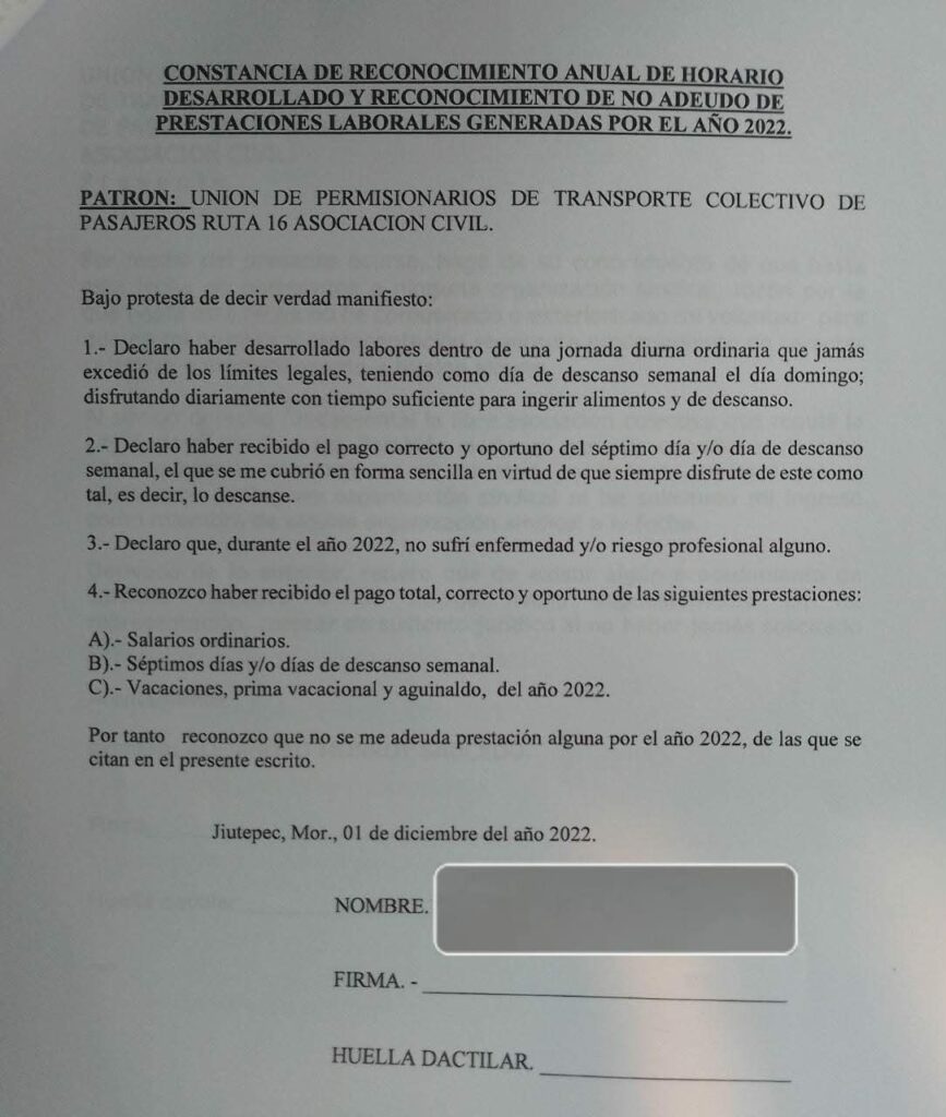 Pero los abusos no terminan ahí. Los conductores son obligados a firmar hojas en blanco que igual sirven como renuncia voluntaria o como documentos de aceptación, un mecanismo de control que les deja expuestos a despidos arbitrarios e injusticias. Además, los choferes cada fin de año deben firmar documentos donde constan montos de aguinaldo que nunca reciben.