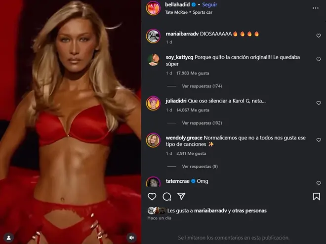 En un principio, se atribuyó el gesto al profesionalismo de la modelo, enfocada en su pasarela. Pero la polémica creció cuando Bella publicó el video de su participación en Instagram y sustituyó la canción original de Karol G por “Sports Car”, de Tate McRae. El cambio provocó una ola de reacciones en redes: muchos lo consideraron una falta de respeto, especialmente porque la sincronía entre la canción de Karol y la caminata de Bella había sido ampliamente elogiada.