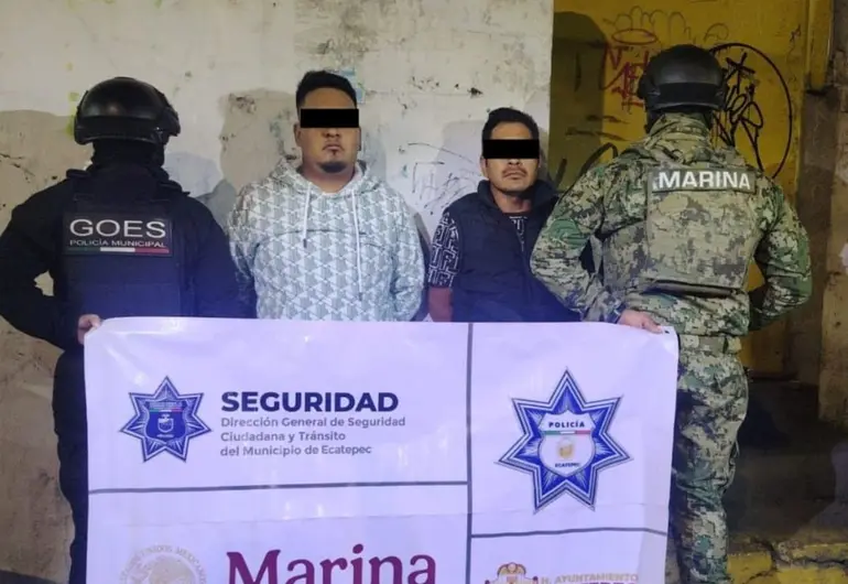 Detienen a dos hombres con arma y decenas de cartuchos en Ecatepec. Durante recorridos de seguridad y prevención del delito, elementos de la Policía Municipal de Ecatepec, en coordinación con la Fuerza de Tarea Marina, detuvieron a dos hombres en la colonia Almárcigo Sur por portar un arma de fuego de uso exclusivo del Ejército, además de 66 cartuchos útiles. Ambos fueron puestos a disposición del Ministerio Público Federal.