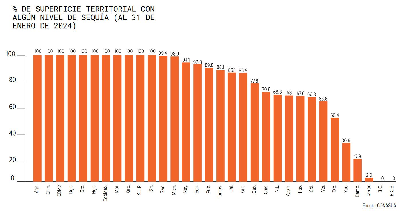 Visto por entidades, ya hay 10 de ellas que registran sequía en el 100% de sus territorios. Aguascalientes; Chihuahua, Ciudad de México, Durango, Guanajuato, Hidalgo, Estado de México. Morelos, Querétaro, San Luis Potosí, Sinaloa, y Zacatecas, donde el porcentaje es de 99.4% del territorio.