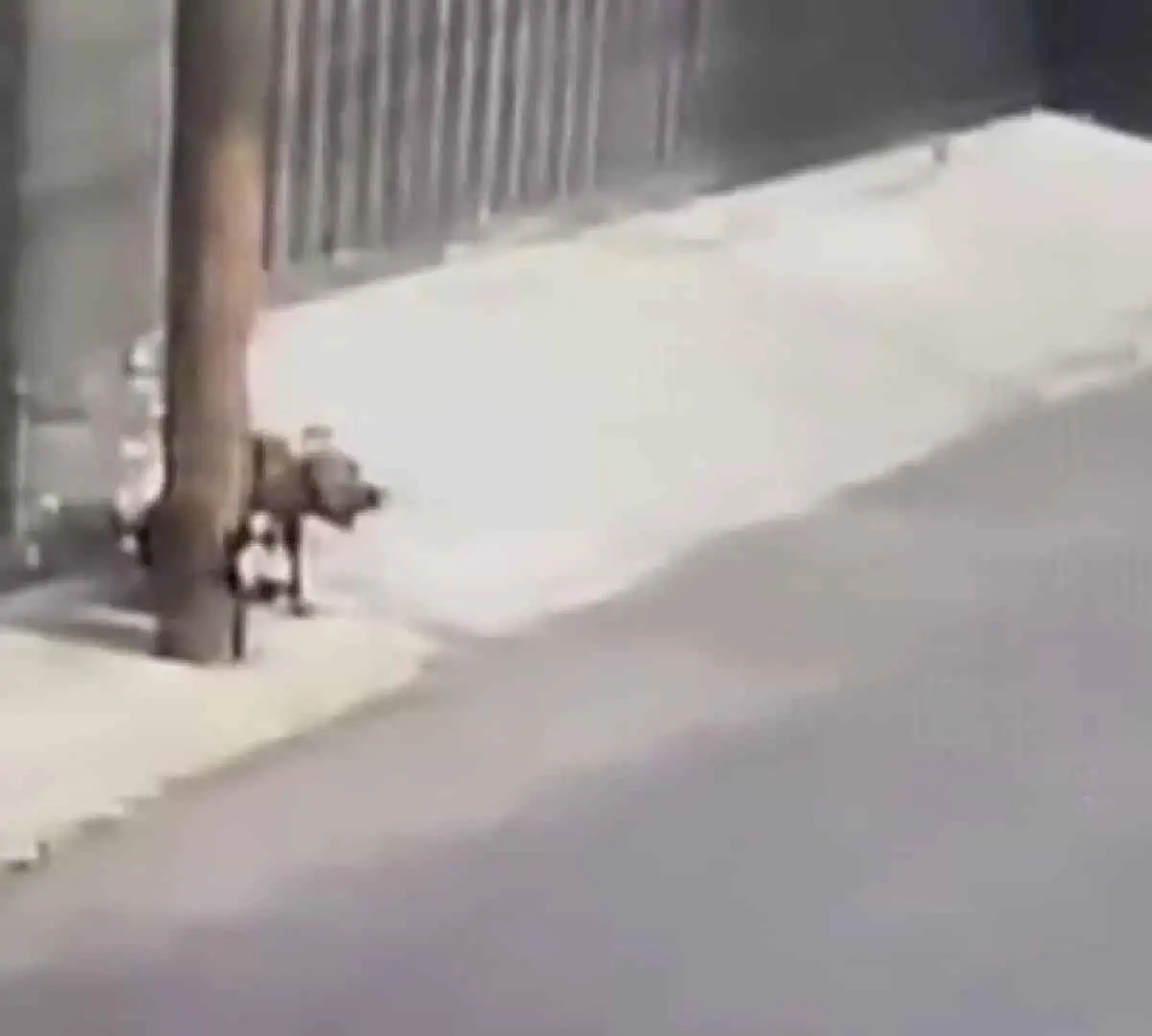 Al llegar a un poste del cableado eléctrico, el sujeto toma al lomito por la correa y lo amarra, se tarda en hacerlo y mientras la mujer se recarga en el poste. Antes de irse el individuo empuja al lomito para que se siente en el piso.