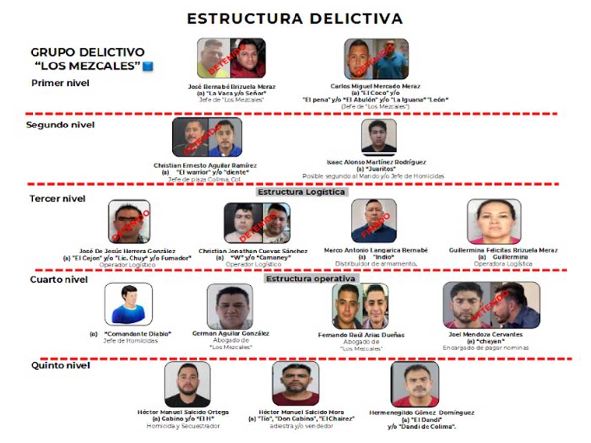 Según reportes de inteligencia del gobierno federal, se ha identificado la estructura del Cártel Independiente de Colima, también conocido como “Los Mezcales”. Dicha organización cuenta con dos abogados que asesoran tanto a sicarios como a negocios involucrados en lavado de dinero, además de “Guillermina”, la única mujer dentro de esta estructura criminal.