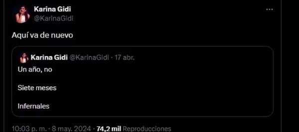 Recientemente, Karina Gidi revivió un antiguo tuit en el que describía su matrimonio como “infernal”. Este gesto reavivó el interés en su relación con Álvarez Máynez, desatando una ola de especulaciones en las redes sociales sobre los motivos detrás de su separación.
