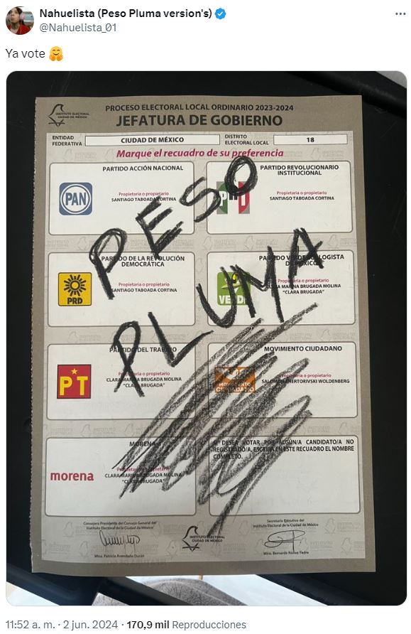 A pesar de la difusión sobre la relevancia de ejercer el derecho al voto y la elección entre Xóchitl Gálvez, Jorge Álvarez Máynez y Claudia Sheinbaum, algunos optaron por anular su voto. Para ello, “votaron” por su artista favorito, como, por ejemplo, Peso Pluma.