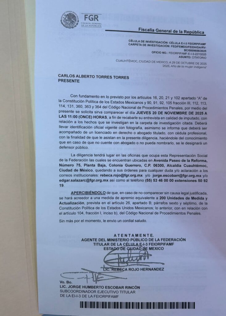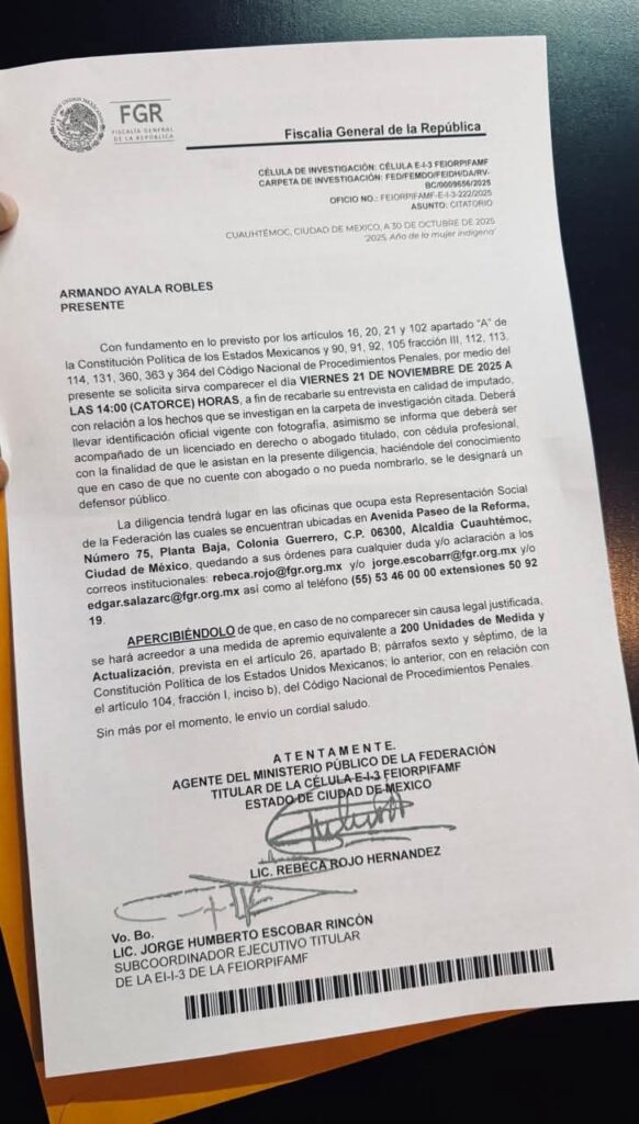La Fiscalía General de la República (FGR) citó a Armando Ayala Robles, Luis Alfonso Torres Torres y Carlos Alberto Torres Torres para comparecer en calidad de investigados, de acuerdo con documentos oficiales que trascendieron en las últimas horas. Las órdenes fueron emitidas por la Célula E-I-3 FEIORPIFAMF, unidad encargada de indagar delitos federales de relevancia.