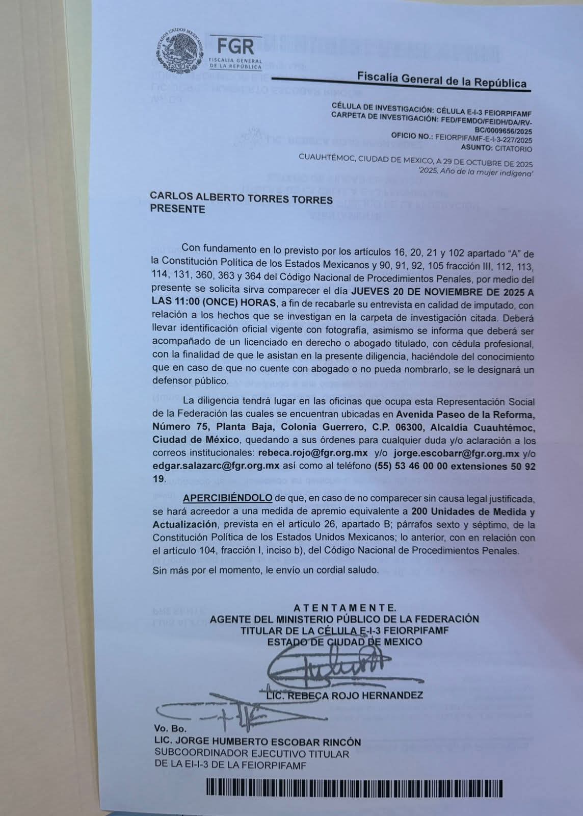 De acuerdo con los documentos, los llamados incluyen la obligación de presentarse con identificación oficial y acompañados de un abogado. Además, se advierte que la ausencia injustificada podría derivar en medidas de apremio conforme a lo establecido en el Código Nacional de Procedimientos Penales, lo que refuerza el carácter obligatorio de la comparecencia.