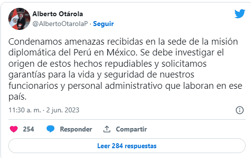 Alberto Otárola Peñaranda, titular del Consejo de Ministros de Perú, denunció que fueron recibidas amenazas de muerte hacia varios diplomáticos de ese país en México, esto tras el conflicto que existe entre Dina Boluarte, presidenta de Perú y Andrés Manuel López Obrador, presidente de México.