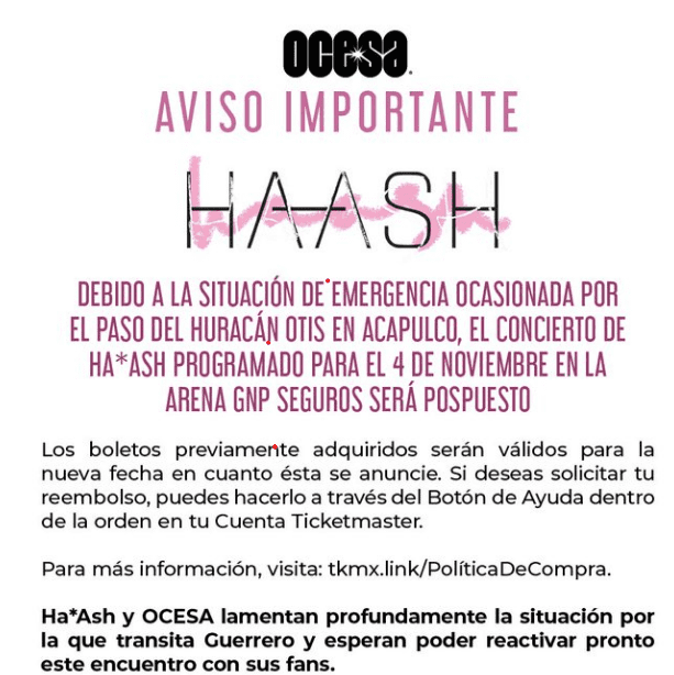 Hace una semana, el huracán Otis causó graves estragos en Acapulco, y poco a poco la ciudad ha ido recuperando la energía eléctrica y la comunicación. Este fenómeno natural devastó el puerto, dejando muchas viviendas y espacios públicos en ruinas, lo que llevó a Ha*Ash a aplazar su concierto.