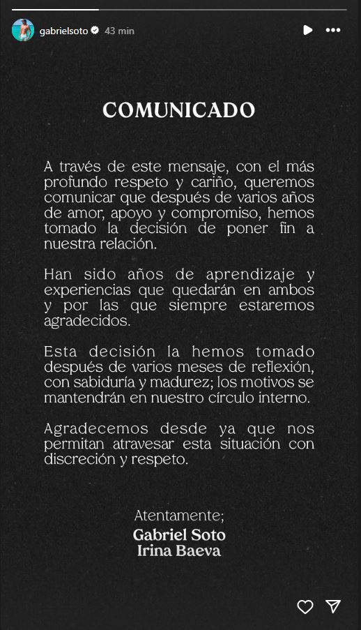 La pareja hizo oficial su ruptura a través de la cuenta de Gabriel Soto, en medio de la controversia generada por la participación de Irina Baeva en “Aventurera”, la hospitalización de Gabriel Soto, y los rumores de una presunta infidelidad con Cecilia Galliano.