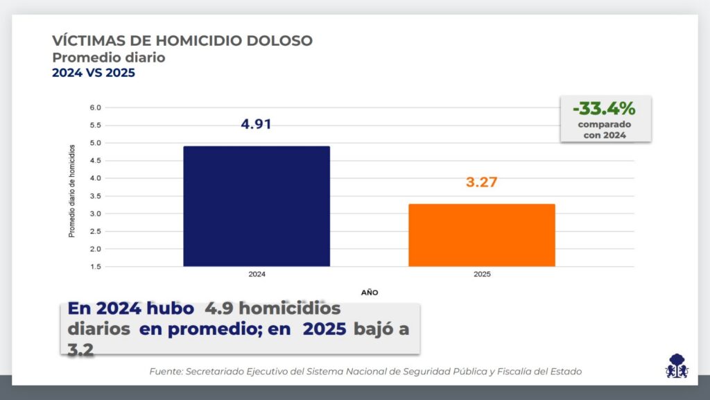 La tendencia anual confirma la consistencia del cambio. En 2019 se registraban en promedio 7.32 homicidios diarios en el estado; para 2025 esa cifra se redujo a 3.27, una baja acumulada de 55 por ciento en seis años. Solo en la comparación entre 2024 y 2025, el promedio diario cayó 33.4 por ciento, de 4.91 a 3.27. La progresión interanual no admite lecturas accidentales: 7.32 en 2019, 7.17 en 2020, 6.49 en 2021, 5.66 en 2022, 5.37 en 2023, 4.91 en 2024, 3.27 en 2025. Una curva descendente que atraviesa administraciones y contextos distintos, pero que en el último tramo presenta su mayor aceleración.