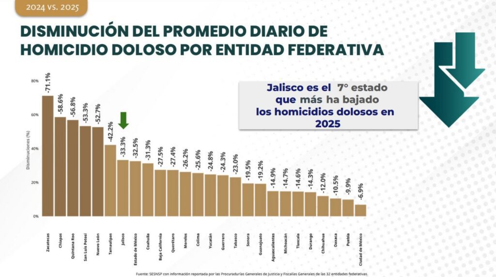 En el contexto nacional, Jalisco se ubicó como el séptimo estado con mayor reducción porcentual de homicidios dolosos entre 2024 y 2025, con una disminución de 33.3 por ciento. Más relevante aún: la entidad salió del grupo de los siete estados que concentran más de la mitad de todos los homicidios del país, un grupo que acumula 50.5 por ciento del total nacional, equivalente a 11,805 casos. En la tasa por cada 10 mil habitantes, Jalisco ocupa el lugar 15 a nivel nacional, con un indicador de 1.44, muy por debajo de estados como Colima, Morelos o Sinaloa, que encabezan ese ranking con tasas superiores a 4.