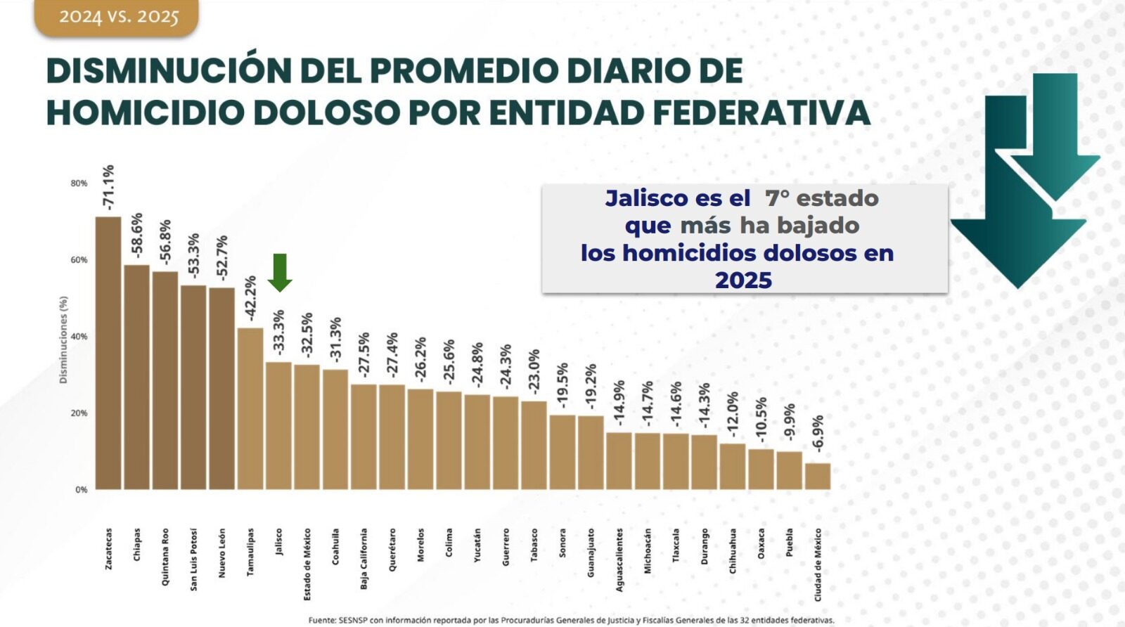 En el contexto nacional, Jalisco se ubicó como el séptimo estado con mayor reducción porcentual de homicidios dolosos entre 2024 y 2025, con una disminución de 33.3 por ciento. Más relevante aún: la entidad salió del grupo de los siete estados que concentran más de la mitad de todos los homicidios del país, un grupo que acumula 50.5 por ciento del total nacional, equivalente a 11,805 casos. En la tasa por cada 10 mil habitantes, Jalisco ocupa el lugar 15 a nivel nacional, con un indicador de 1.44, muy por debajo de estados como Colima, Morelos o Sinaloa, que encabezan ese ranking con tasas superiores a 4.
