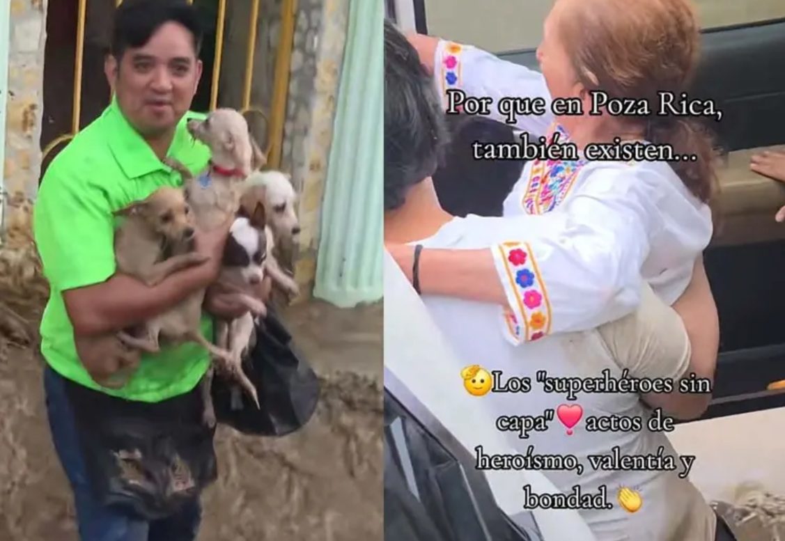 Además, ha escalado techos y retirado escombros para rescatar perros atrapados, visiblemente asustados y mojados por la corriente. Su labor ha sido ampliamente difundida en redes, donde miles lo reconocen como el “ángel guardián de Poza Rica”.