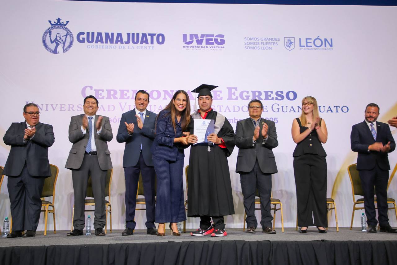 La UVEG transforma vidas y cambia destinos de más estudiantes. La Gobernadora de la Gente, Libia Dennise García Muñoz Ledo, encabezó la Ceremonia Extraordinaria de Egresados de la Universidad Virtual del Estado de Guanajuato (UVEG) 2025, que se realizó en el Poliforum de León.