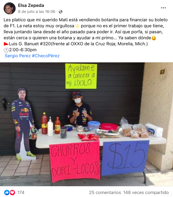 Para cumplir este anhelo, el fan de Checo montó un puesto de frituras (churritos y Dori-locos) afuera de su casa con el fin de juntar algo de dinero y pagar el costo de su localidad para asistir al Autódromo Hermanos Rodríguez.
