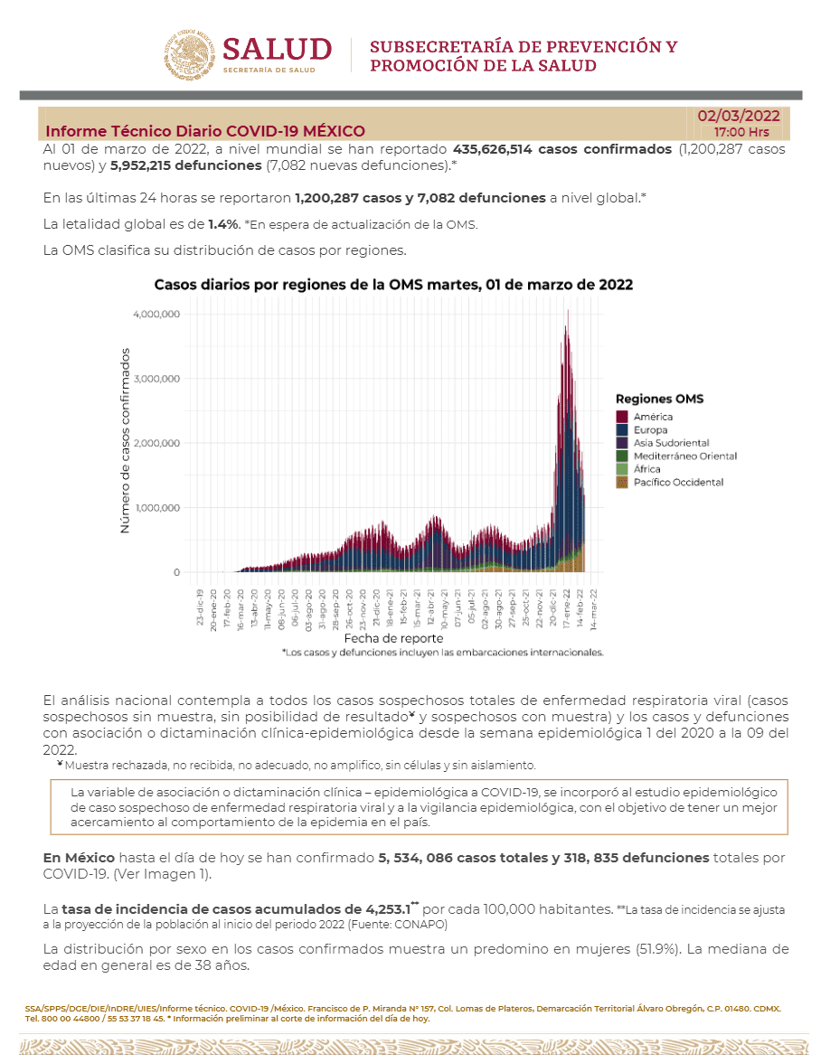 México reportó este miércoles 304 nuevas muertes y 12 mil 342 contagios por COVID-19, con lo que totaliza 5 millones 534 mil 86 casos y acumula 318 mil 531 decesos en total, informó la Secretaría de Salud.