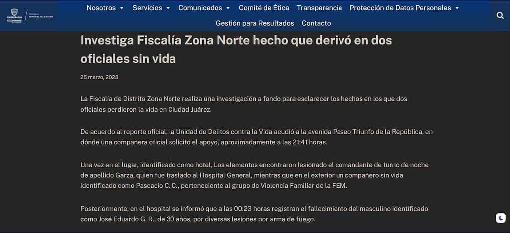 Los hechos ocurrieron afuera de un hotel, ubicado en la avenida Paseo Triunfo de la República, según el comunciado de prensa emitido por la Fiscalía General del Estado de Chihuahua.