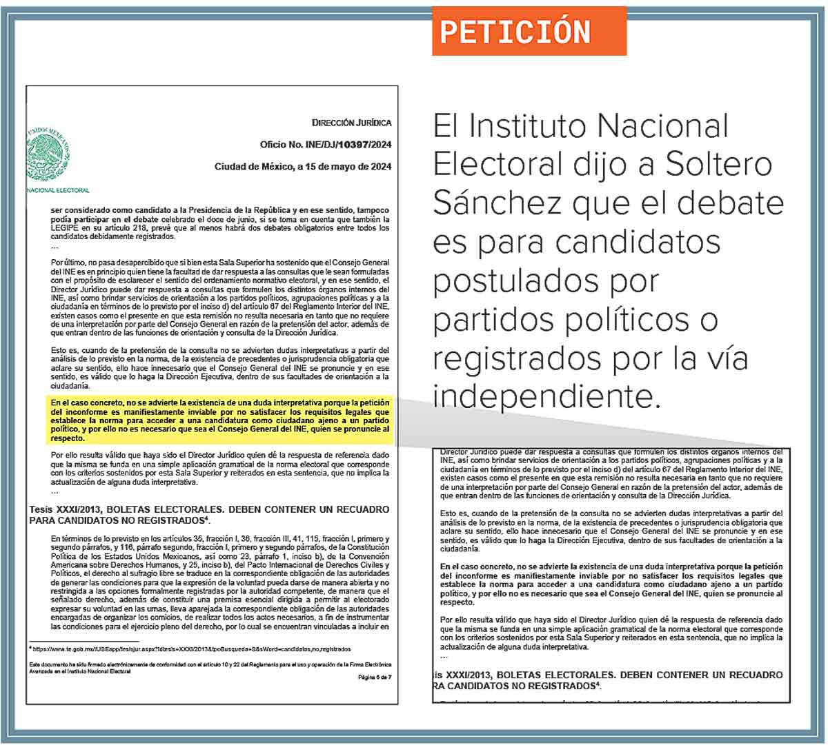 Después de rechazar su participación en el debate presidencial, justificado en distintos ordenamientos, el funcionario del INE concluye su respuesta argumentando que “si bien el Consejo General del INE aprobó la celebración de tres debates obligatorios entre todos los candidatos a la Presidencia de la República en el PEF 2023-2024, de manera expresa la ley establece que, sólo pueden participar los candidatos que cuenten con registro para contender por el cargo de elección en cuestión, por lo que, atendiendo al marco jurídico aplicable, así como a lo establecido en la sentencia SUP-JDC-360/2018, no es posible atender su solicitud para que se le permita participar en el debate programado para el 19 de mayo de 2024”.