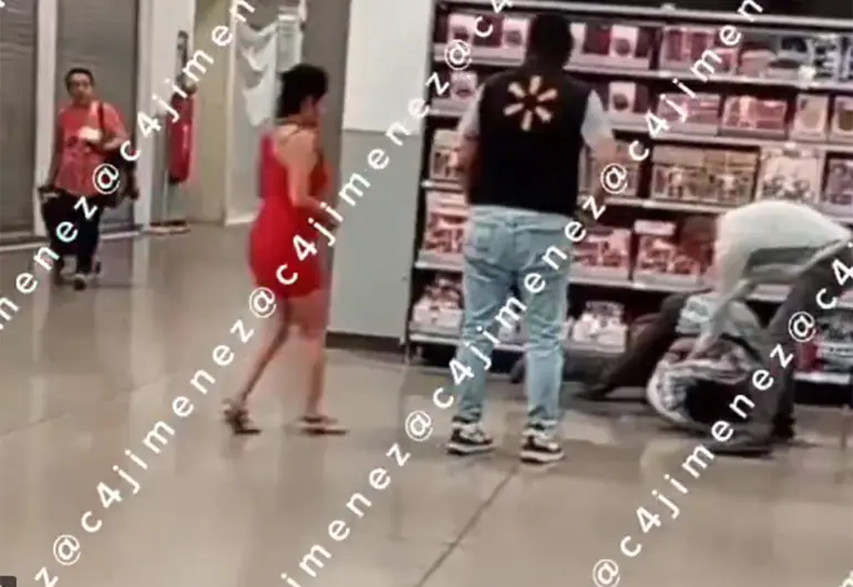 En el clip se observa la confrontación: la mujer encara al guardia y le reclama, mientras que el empleado, visiblemente molesto, la empuja, provocando que caiga al suelo. La situación continúa escalando ante la negativa de la pareja a asumir responsabilidad por el robo.