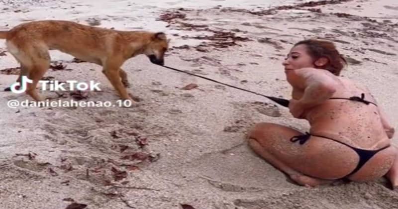 En el video, publicado en TikTok, se puede ver a la perrita jugando con la guapa joven hasta que comienza a quitarle parte del bikini.
