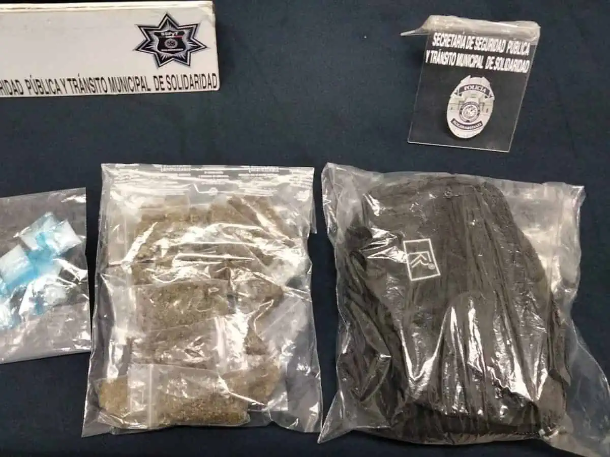 Policía municipal detiene a un hombre con drogas en Solidaridad. Aseguraron a un sujeto en posesión de posible marihuana y cristal, en las inmediaciones de la colonia irregular In House.