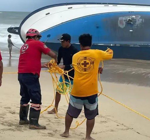Un yate encalló en las playas de Puerto Escondido, Oaxaca, la mañana de este jueves, tras sufrir una falla mecánica y ser impactado por el fuerte oleaje provocado por la tormenta tropical “Raymond”.