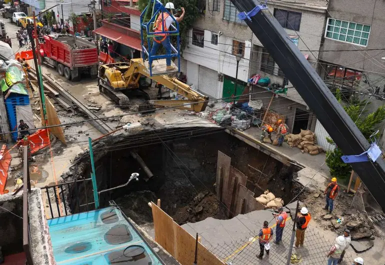 El socavón, que se abrió el 17 de septiembre, tiene 12 metros de diámetro y ocho de profundidad, y fue provocado por la ruptura de una tubería de 2.4 metros de grosor.