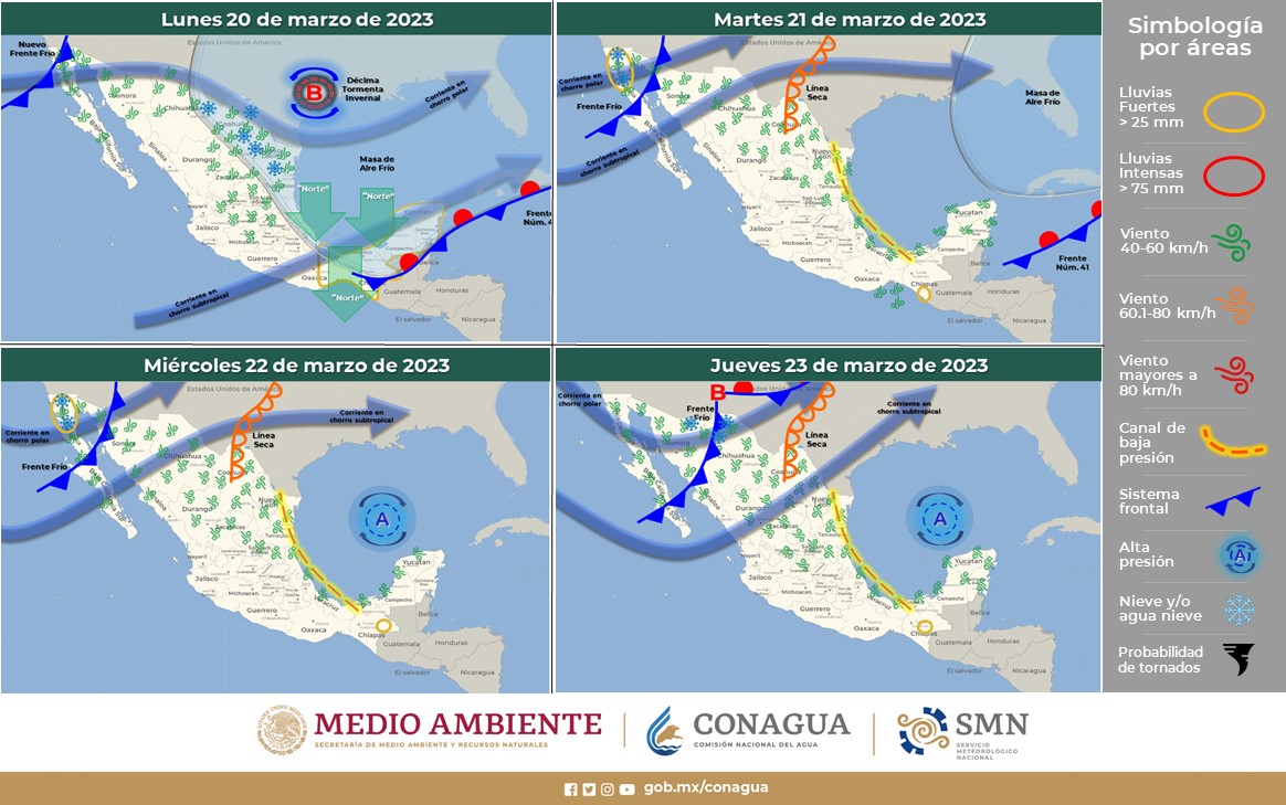 Además, la décima tormenta invernal se desplazará gradualmente hacia el sureste de Estados Unidos y durante la mañana producirá condiciones para la caída de nieve o aguanieve en zonas altas de Coahuila y Nuevo León.