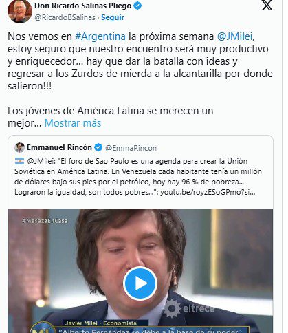El 27 de noviembre, el dueño de TV Azteca respondió a una publicación del presidente argentino, quien afirmó que los “zurdos” roban el fruto del trabajo ajeno.