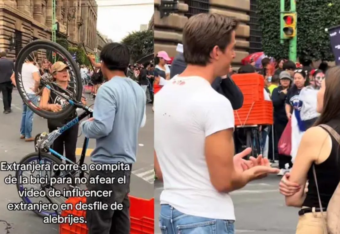 El incidente ocurrió en las inmediaciones del Palacio de Bellas Artes, donde los alebrijes hacían su recorrido frente a cientos de asistentes y creadores de contenido que grababan el evento. El trabajador, que transportaba cajas plásticas en la parte trasera de su bicicleta, intentaba cruzar la calle cuando fue bruscamente detenido por el equipo del extranjero.