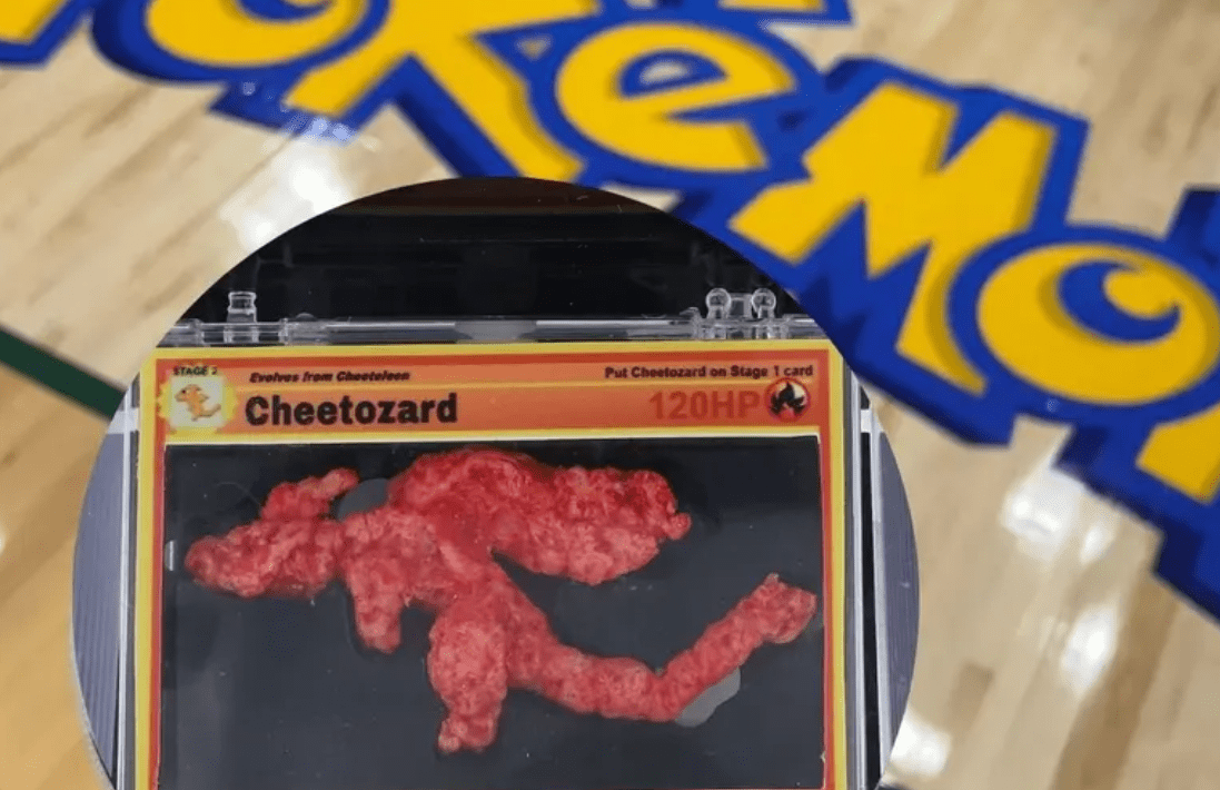 El “Cheetozard” está encapsulado en una caja transparente y acompañado por una carta de Pokémon personalizada, lo que le da un toque único y exclusivo.