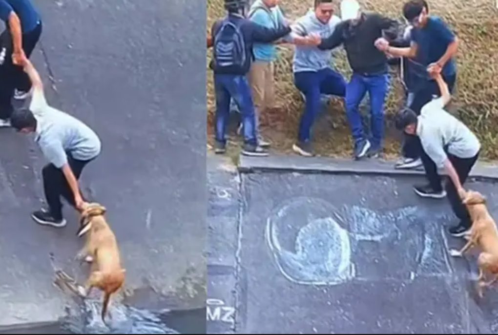 Un grupo de ciudadanos formó una cadena humana para rescatar a un perro que cayó a un canal de aguas negras.